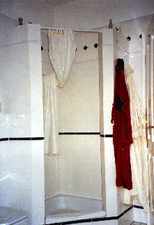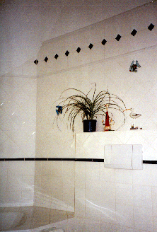 | Wunschbad, Wandfliesenbelag VuB Creative System 15/15 cm weiß glasiert. Sockelbereich umlaufend im Fugenraster verlegt, als Abschluß Bordüre 3/20 cm kobaltblau glasiert. Mittlerer Wandbereich umlaufend diagonal verlegt, als Abschluß Bordüre 3/20 cm weiß glasiert. Oberer Wandabschluß 2-reihig, 6-eck-Fliesen mit Einleger 5/5 cm kobaltblau und als oberster Abschluß, Bordüre 5/20 cm gewölbt. Bodenfliesenbelag VuB, Creative System 15/15 weiß-matt, diagonal verlegt mit umlaufendem Fries. (Bild rechts) |