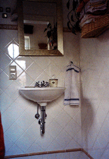 |  Gäste-WC. Wandfliesenbelag 15/15 cm weiß glasiert, Sockelbereich 1 Reihe, Verlegung im Fugenraster, Abschluß Terrakottabordüre 3/20 cm gewölbt. Wandfliesenbelag sonst umlaufend diagonal verlegt, mit Terrakottabordüre 5/20 cm als Abschluß. |