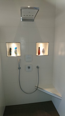 Steingut Wandfliesen 30/90cm, Feinsteinzeug Bodenfliesen 30/60cm mit Einbau einer Elektrofussboden und -Wandheizung im gesamten Duschbereich einschließlich der Sitzfläche
