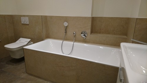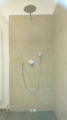 Feinsteinzeug Wandbelag 60/120cm und Bodenbelag 60/60cm, barrierefreiem Duschbereich mit Wandeinlauf und eingebauter Glasduschwand