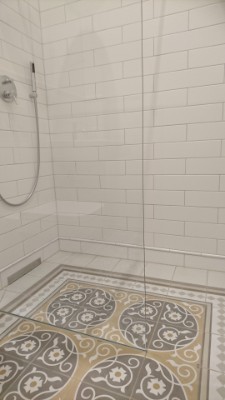 Barrierefreie Dusche mit Wandeinlauf Wand- & Bodenfliesen im Retro Look