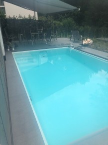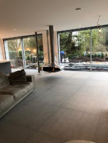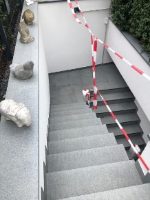 Verlegung und Einbau von: 350qm Granit "Padang 054" dunkel geflammt 2cm, in den Formaten 100/100cm, 80/80cm, 60/60cm, 40/40cm und 130/50cm. 70 Stück gewendelte und gerade Treppenstufen, 200 Stück Glasbausteine 20/20 türkis matt.